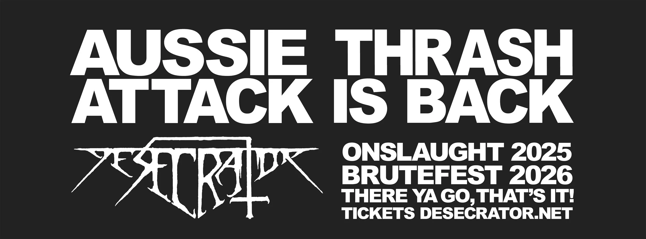 AUSSIE THRASH ATTACK IS BACKONSLAUGHT 2025BRUTEFEST 2026 Buy Tickets STREAM SUMMONING ALBUM NOW More Music MERCH COLLECTION Desecrator Merch sale Quick View LIMITED EDITION Summoning LP Blue Splatter Sale Price:A$39.00 Original Price:A$55.00 sale Quick View SUMMONING Album - Vinyl LP Sale Price:A$25.00 Original Price:A$35.00 sale Quick View LIVE TIL DEATH - 10th Anniversary Vinyl Re-issue Sale Price:A$30.00 Original Price:A$35.00 sale Quick View TO THE GALLOWS Album - Vinyl LP Sale Price:A$30.00 Original Price:A$35.00 sale Quick View SUMMONING T-Shirt (LIMITED SIZES - SUPER CHEAP) from A$10.00 sale Quick View MANIC T-Shirt (LIMITED SIZES - SUPER CHEAP) from A$10.00 sale Quick View "TUXACRATOR" T-Shirt (LIMITED SIZES - SUPER CHEAP) from A$5.00 sale Quick View "THRASH TIL DEAF" T-Shirt (ONE LEFT!) Sale Price:A$10.00 Original Price:A$20.00 Browse all merch >>